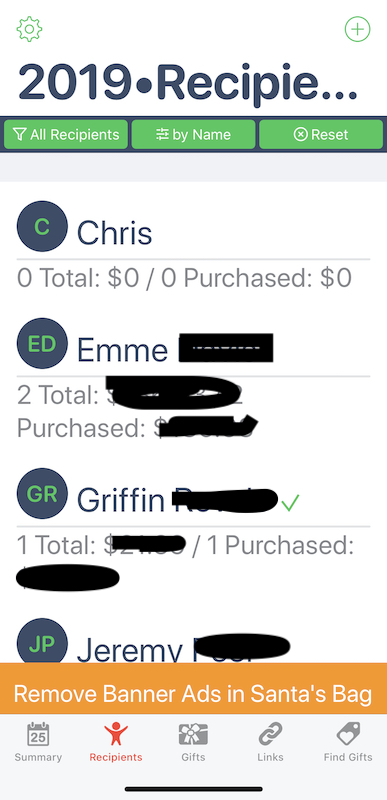 First, I enter the names of everyone for whom I need to purchase a gift. You can set up an overall budget and/or individual budget. Unfortunately, I have great difficulty sticking to one, so I just try to keep a close look and make sure I’m equitable with purchases. When I purchase a gift for a recipient, I enter the name of the gift, the store from which it was purchased and the purchase price.