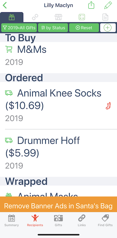 Once the name of a gift is entered for a recipient, there are several icons to select that put the item in a list that tells you the status of what you have completed and what you still need to do. Those include: Idea; To Buy; Ordered; To Wrap; Wrapped; To Send; and Given. An additional icon identifies a gift as Stocking Stuffer. I request wish lists from family members and label the items as Ideas. Then, when I purchase a gift, I select the Ordered icon. When the gift arrives (I am well acquainted with the UPS and FedEx delivery people!), I